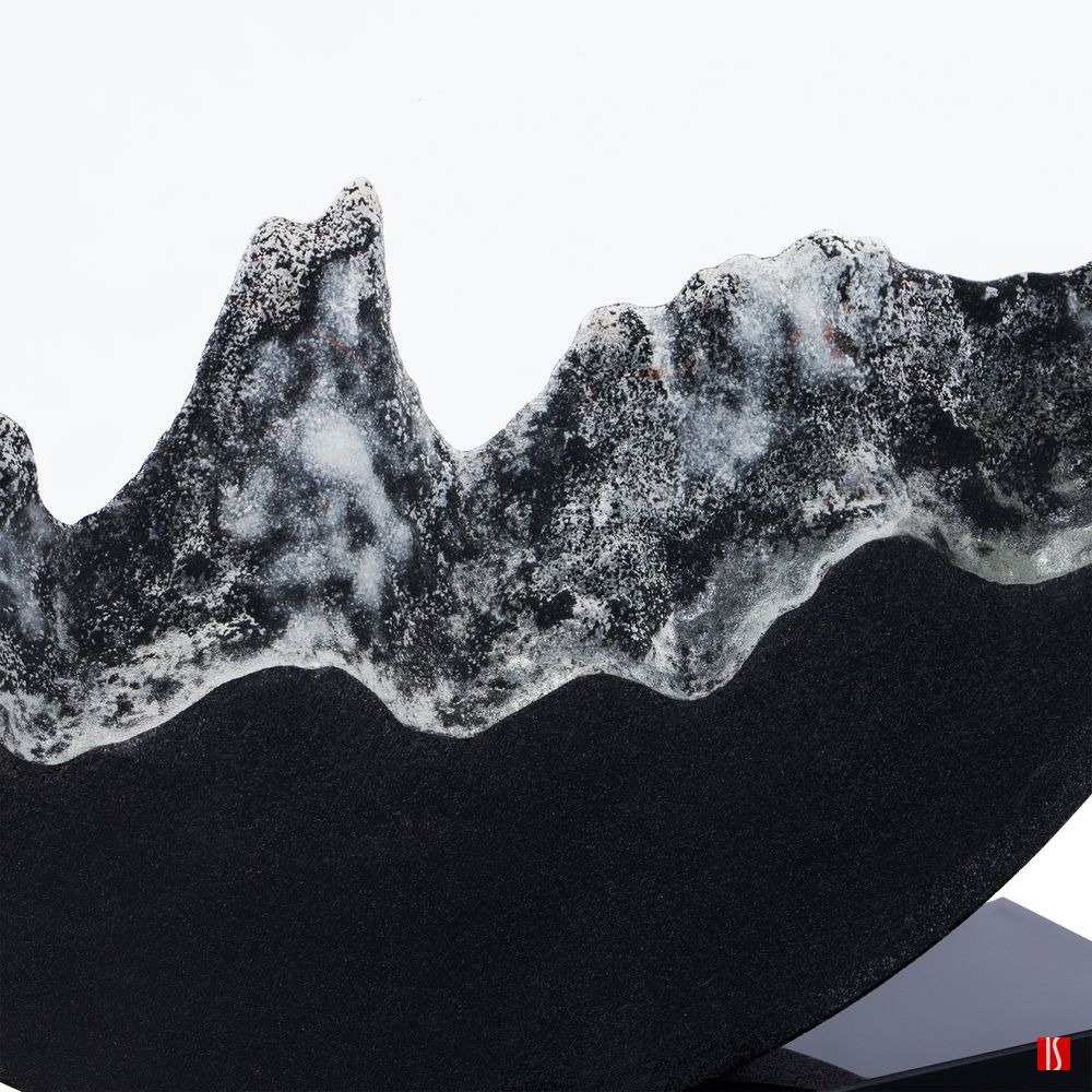 Нижняя часть стелы выполнена при помощи каменного литья из смеси специальной смолы с кварцевым черным и белым песком, тщательно отшлифованной после спекания при низкой температуре. Такой технологический прием создает завораживающую картинку внутри самой стелы, напоминающую горный хребет: яркий символ как преодоления, так и умиротворения.