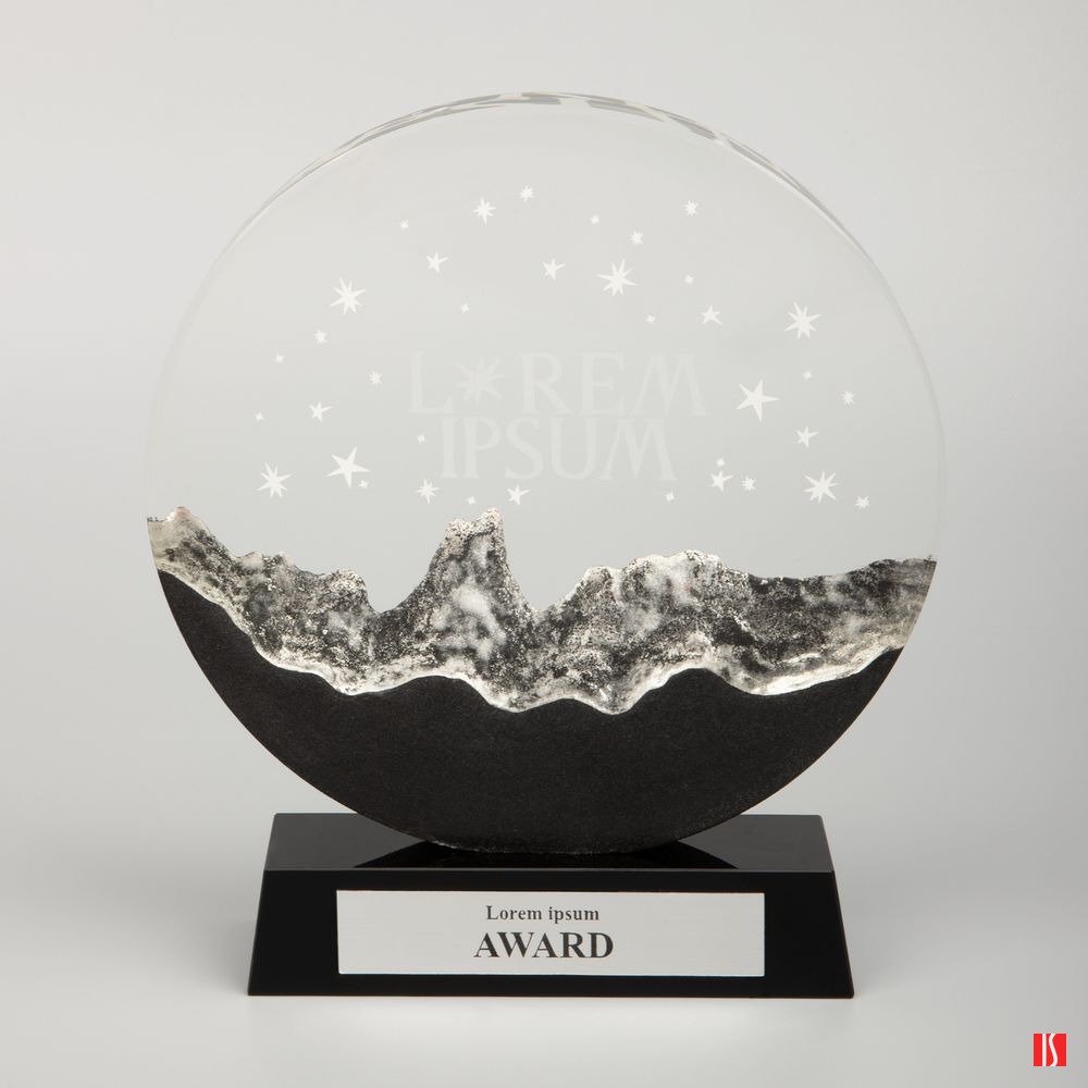 Прозрачная круглая часть и черное основание стелы изготовлены из премиального стекла К9, в основе которого лежит оптическое боросиликатное стекло. Эту марку стекла отличает низкий процент посторонних включений, высокий показатель преломления и высокая прозрачность — идеальные качества для изготовления наград премиального уровня.