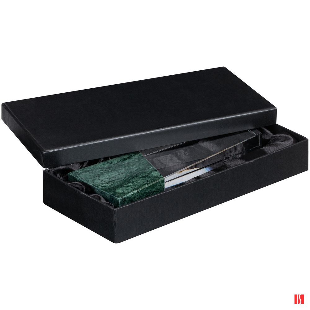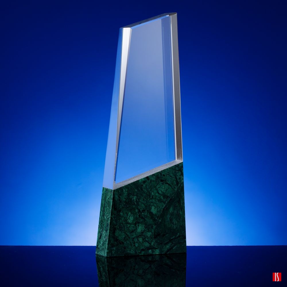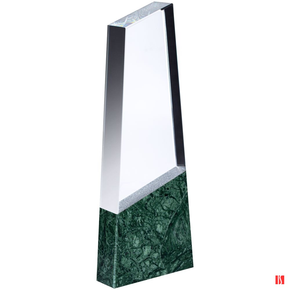 На основании из серпентина закреплен блок из стекла К9, в основе которого лежит оптическое боросиликатное стекло. Эту марку стекла отличает низкий процент посторонних включений, высокий показатель преломления и высокая прозрачность — идеальные качества для изготовления наград премиального уровня.