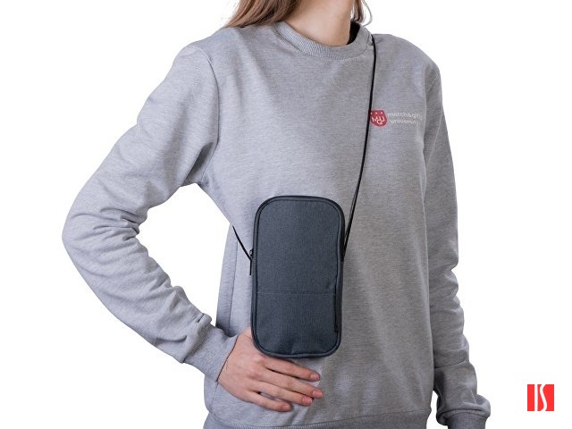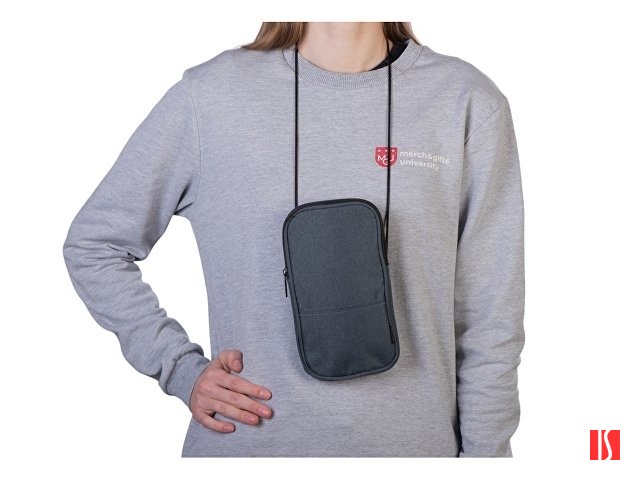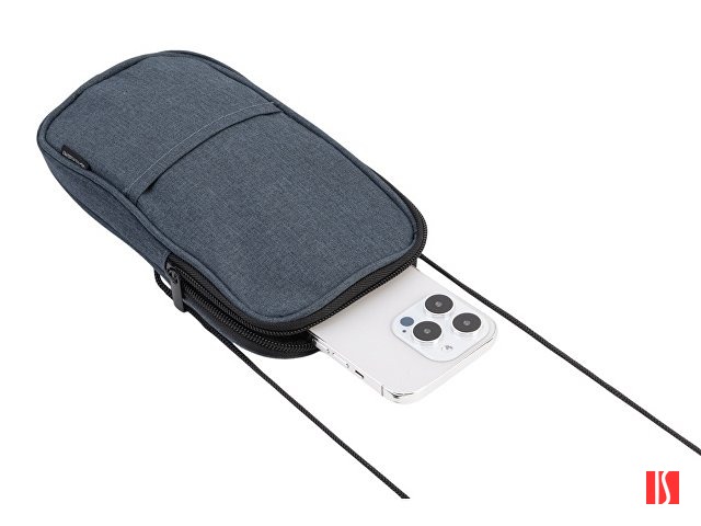 Мобильный чехол из полиэстера RPET. Основное отделение с застежкой-молнией. Внешний карман. В комплект входит шнурок для переноски. Длина шнурка 122 см. Заказать с нанесением логотипа от компании «Синтезис».