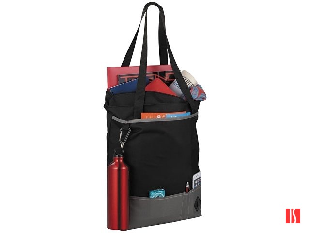 Сумка Hayden. Сумка для покупок с большим основным отделением на молнии и скошенным карманом спереди на застежке липучке. Дополнительный карман внизу для размещения ваших мелких вещей. Карабин для ключей или бутылки для воды. Высота ручек 37см. 600D полиэстер. Заказать с нанесением логотипа от компании «Синтезис».