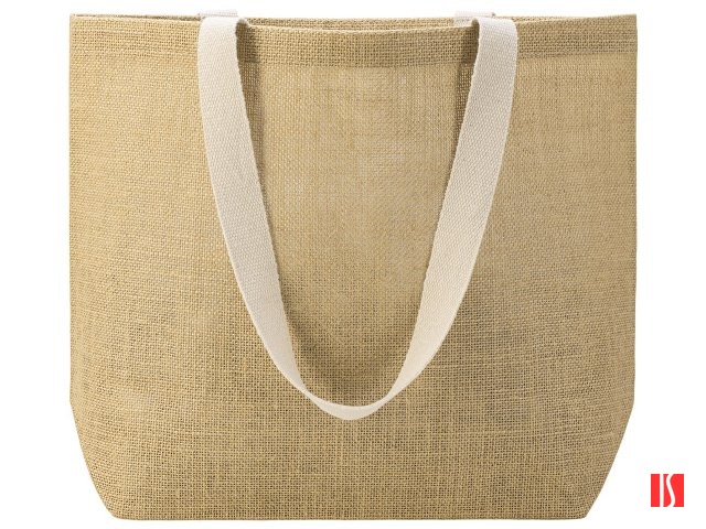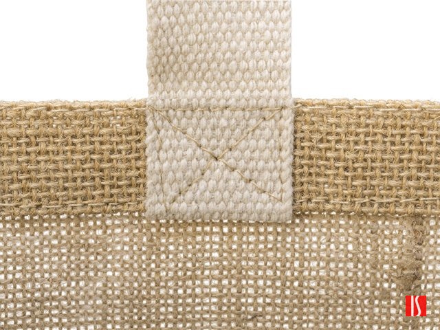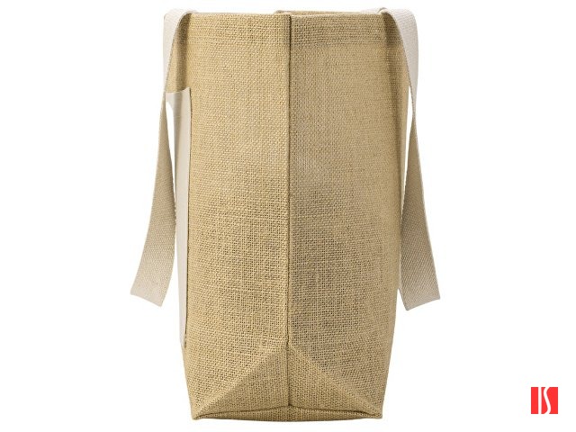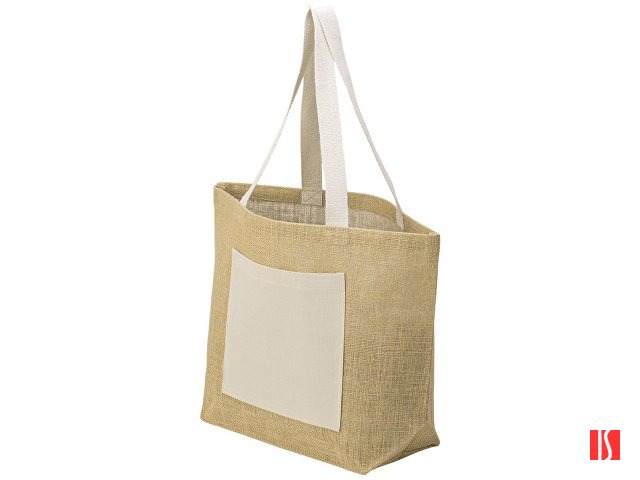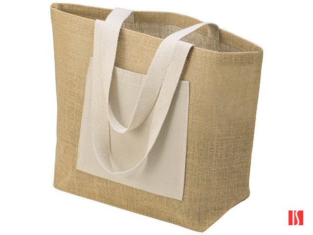 Сумка для покупок из ламинированного джута с большим хлопковым карманом спереди и широкими парусиновыми ручками из натурального хлопка. Благодаря расширенному дну сумка обладает большой вместимостью. Заказать с нанесением логотипа от компании «Синтезис».