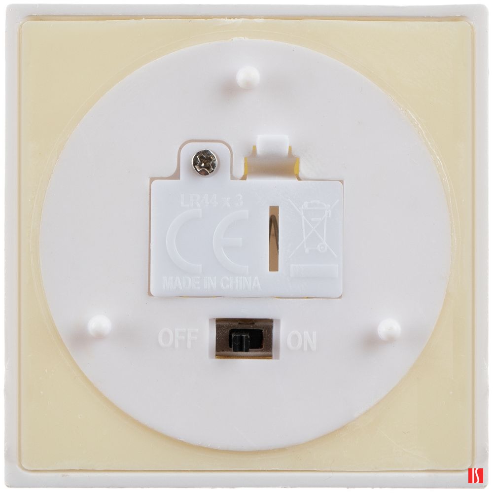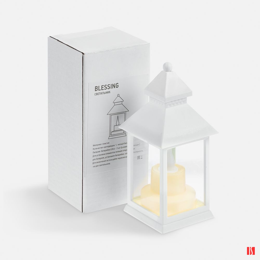 Внутри LED-свеча с теплым светом. Работает от 3 батареек типа LR44 (в комплект не входят). Заказать с нанесением логотипа от компании «Синтезис».