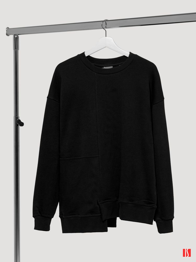 Свитшот унисекс свободного кроя со спущенным плечом и нестандартным нижним краем.