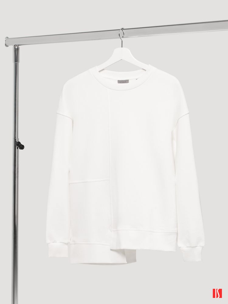 Свитшот унисекс свободного кроя со спущенным плечом и нестандартным нижним краем.