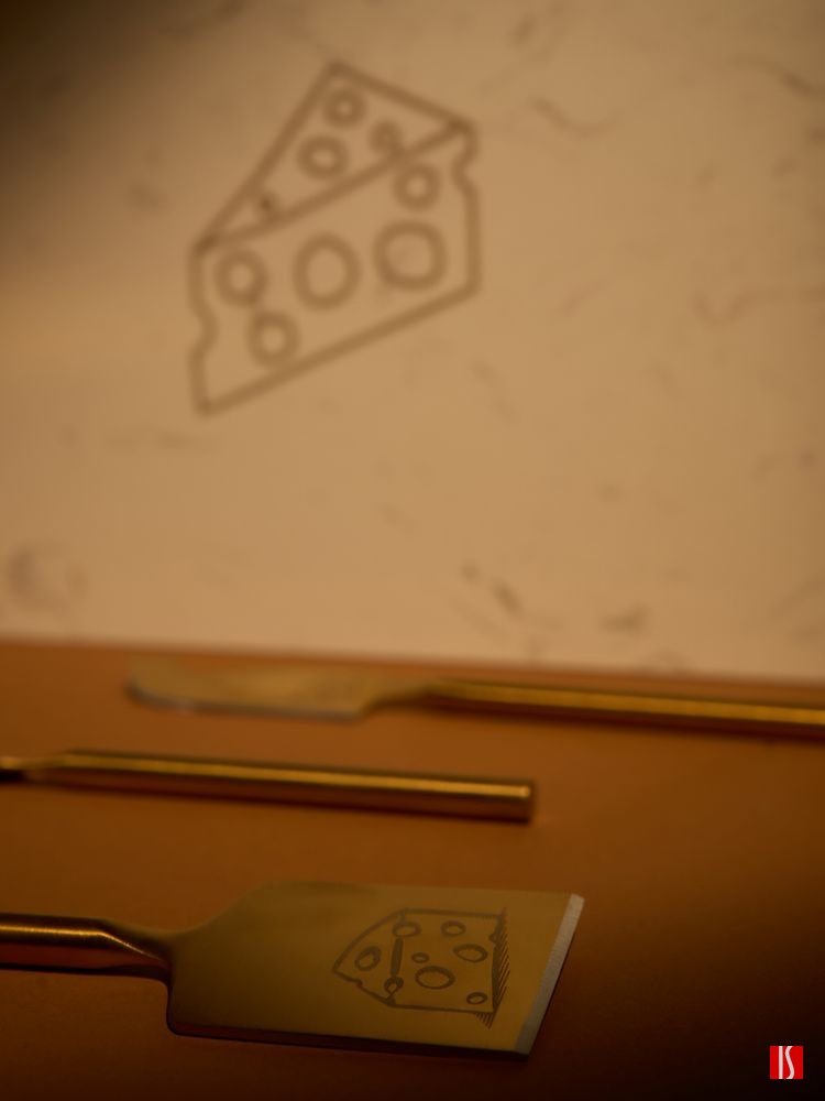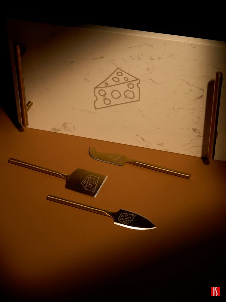 Золотистый цвет ручек и трех ножей подчеркивает статус всего набора и возвышенность самой сырной дегустации. При нарезке мягких сортов сыра особенно важно сохранить эстетичный вид ломтиков, поэтому здесь не обойтись без специальных ножей. Нож-лопатка удобен как для нарезки, так и для сервировки мягких и полутвердых сортов, а еще им можно красиво раскрошить твердый сыр. А нож с раздвоенным кончиком можно также использовать в качестве элегантной вилки. Листовидный нож для твердых сортов — это проверенная классика, которой можно доверить пармезан.
