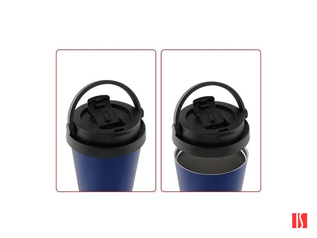 Термоизоляция защищает корпус от нагрева при хранении горячих напитков и от появления конденсата от холодных. Поэтому термостакан безопасно держать в руках и ставить на любые поверхности. Такой термопосуде не нужна традиционная ручка, но для удобства переноски предусмотрена поворотная ручка на крышке. В сложенном виде она интегрируется в плоскость крышки, плотно фиксируется за счет специального выступа и не мешает при питье. В процессе выпивания напитка крышку можно не снимать – в её конструкции предусмотрен откидной клапан, который легко открывается и закрывается одной рукой. Он защищает напиток от попадания пыли внутрь, а также минимизирует влияние температуры окружающей среды, способствуя сохранению напитка горячим или холодным длительное время. В положении «открыто» клапан плотно фиксируется в плоскости крышки и не опрокидывается при питье. В крышке предусмотрены два отверстия – питьевое и воздушное для обеспечения плавного потока жидкости.