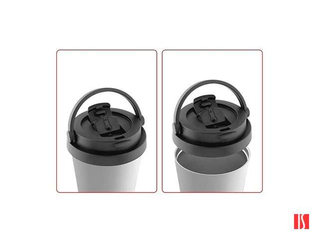 Термоизоляция не позволяет нагреваться корпусу кружки от горячих напитков, на нём не образуется конденсат от холодных. Поэтому термостакан безопасно держать в руках и ставить на любые поверхности. Такой термопосуде не нужна традиционная ручка, но для удобства переноски предусмотрена ручка на крышке. В сложенном виде она интегрируется в плоскость крышки, плотно фиксируется за счет специального выступа и не мешает при питье. В процессе выпивания напитка крышку можно не снимать – в её конструкции предусмотрен откидной клапан, который легко открывается и закрывается одной рукой. Он защищает напиток от попадания пыли внутрь, а также минимизирует влияние температуры окружающей среды, способствуя сохранению напитка горячим или холодным длительное время. В положении «открыто» клапан плотно фиксируется в плоскости крышки и не опрокидывается при питье. В крышке предусмотрены два отверстия – питьевое и воздушное для обеспечения плавного потока жидкости.