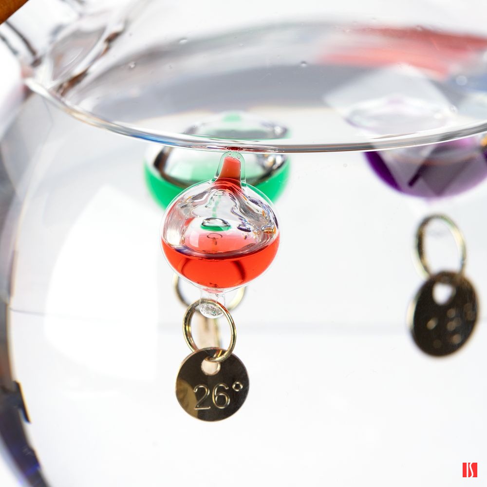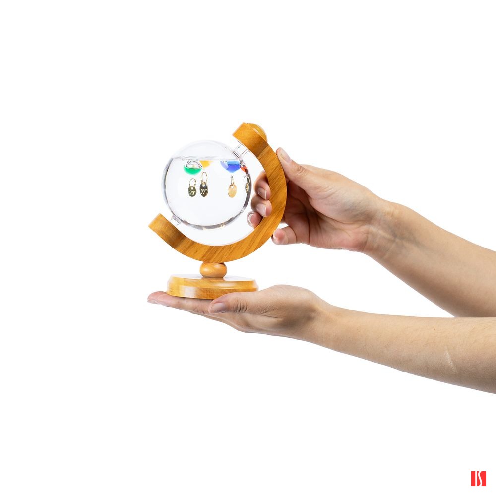 Термометр Галилео оригинальной формы, напоминающей глобус, добавит индивидуальности домашнему или офисному интерьеру. В основе его работы лежит физическая закономерность, впервые отмеченная великим Галилео Галилеем: плотность жидкости увеличивается при снижении температуры и уменьшается при ее повышении. И теперь стеклянные шарики в жидком парафине не только радуют глаз, но и позволяют с легкостью определить температуру в помещении.