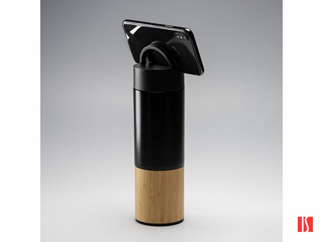 Термос из нержавеющей стали 304 с двойными стенками и деталями из бамбука. Идеален для поддержания напитков горячими и холодными. Крышка с ручкой, функция подставки под мобильный телефон. Объем 450 мл. Заказать с нанесением логотипа от компании «Синтезис».