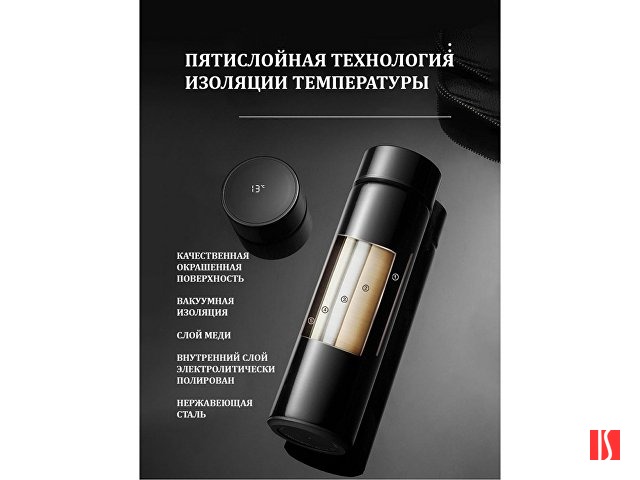 Металлический термос с двойными стенками и датчиком температуры.