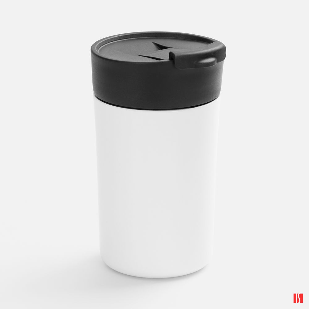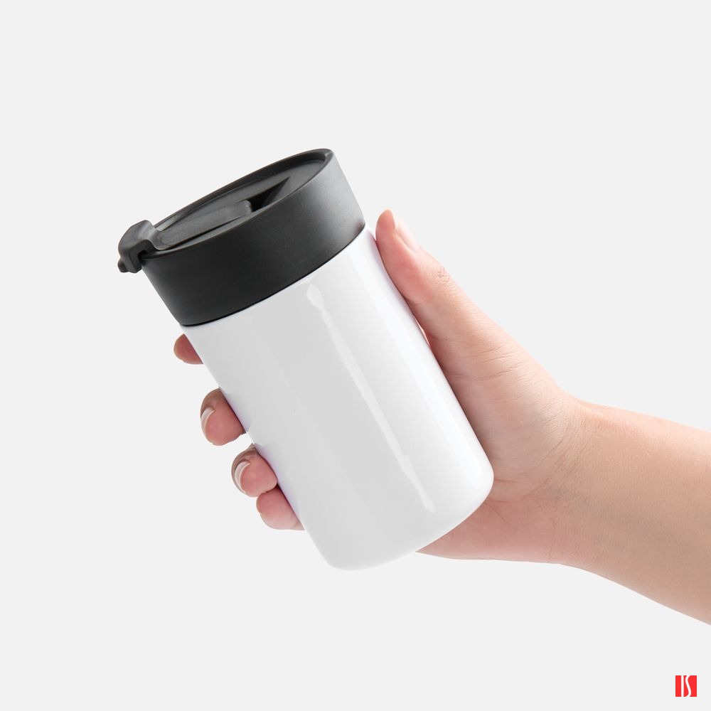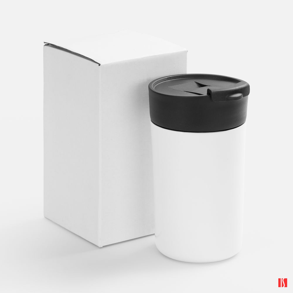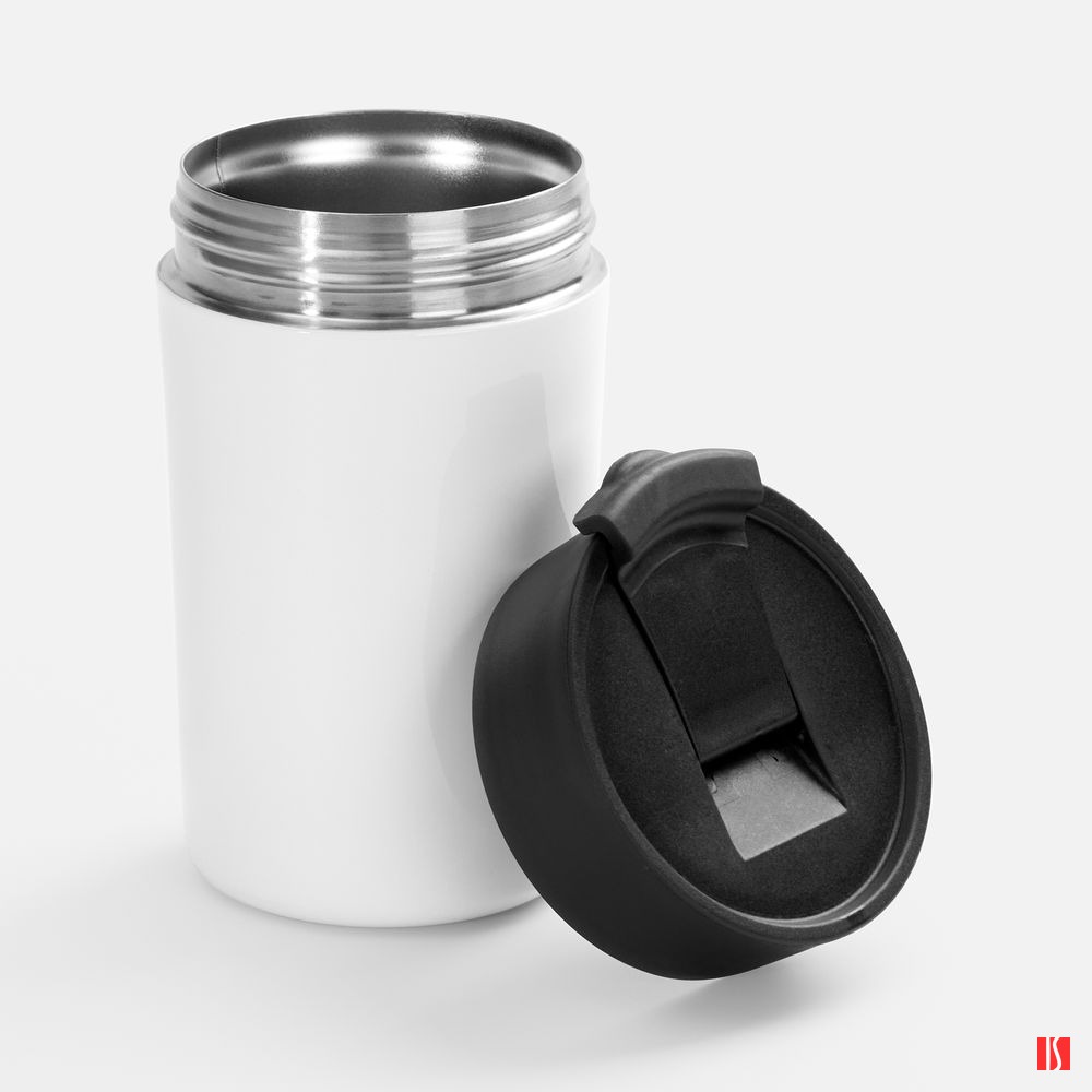 Заказать с нанесением логотипа от компании «Синтезис». Компактный термостакан с сублимационным покрытием.