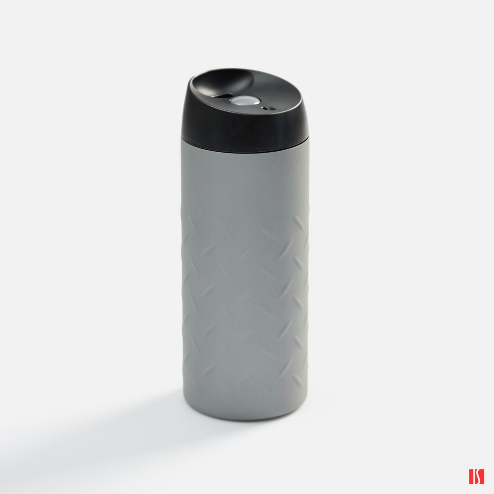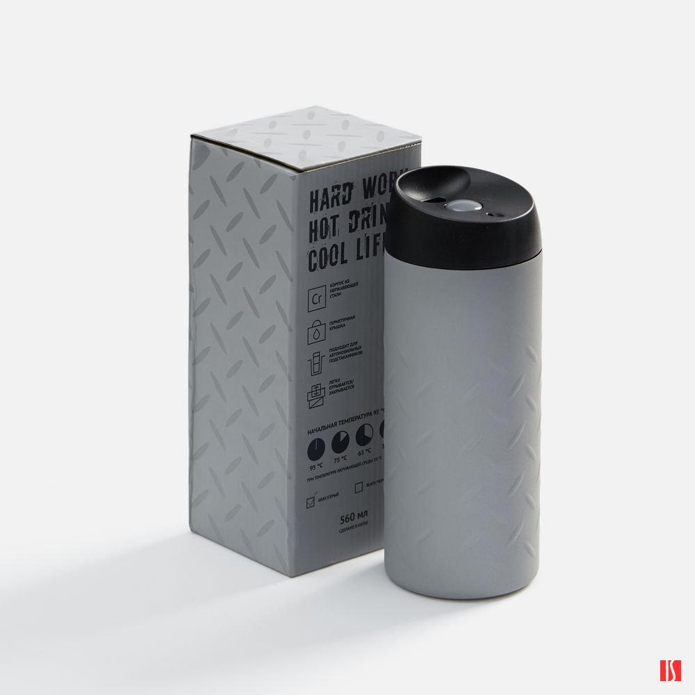 Двухслойная вакуумная конструкция из нержавеющей стали. Герметичная завинчивающаяся крышка с нажимным клапаном для питья. Стакан подходит для большинства автомобильных подстаканников.