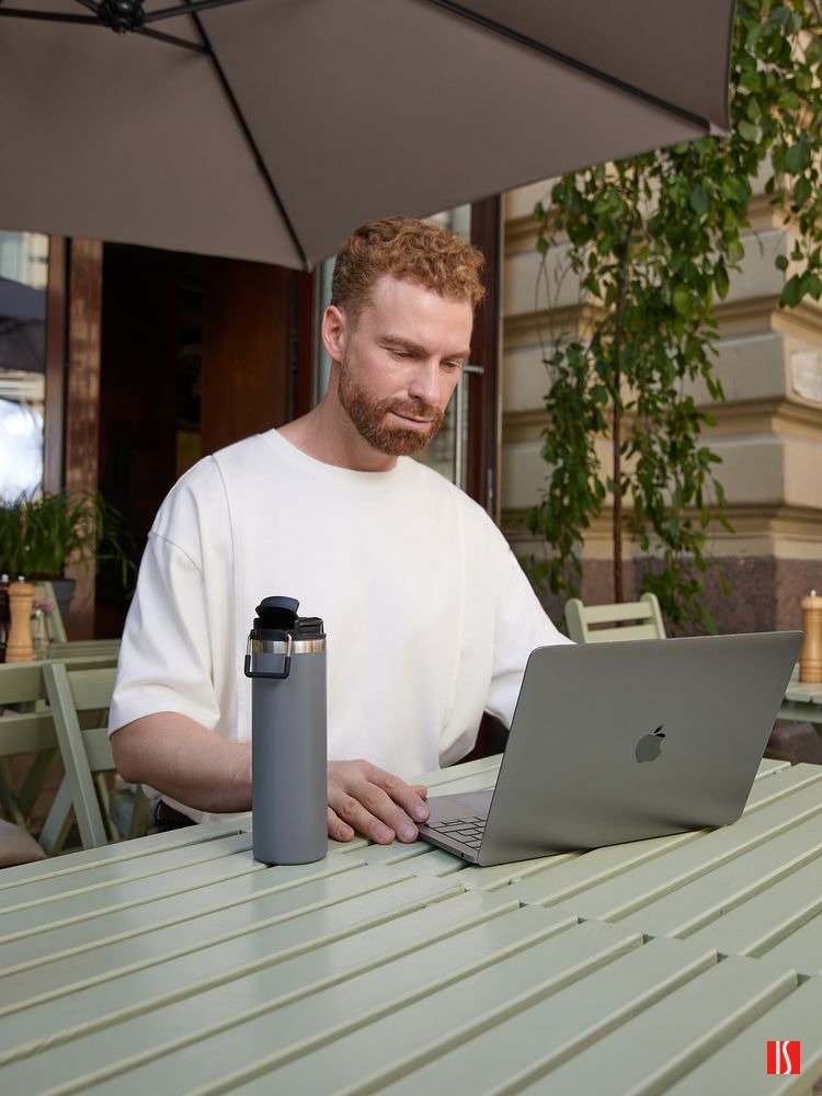 Заказать с нанесением логотипа от компании «Синтезис». Лаконичный дизайн с ровным цилиндрическим корпусом — специально для круговой печати и гравировки, достаточный объем и привлекательная деталь в виде подвижной квадратной ручки для переноски.