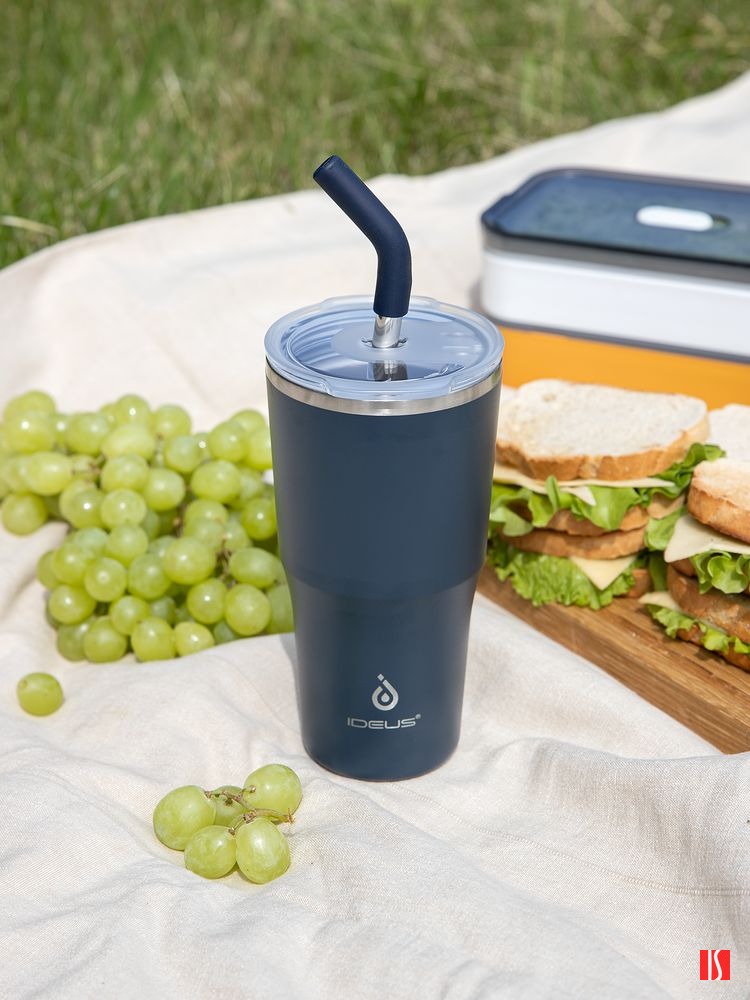- 2 крышки в комплекте: одна на 100% герметичная с механизмом блокировки отверстия для питья, вторая — с отверстием для трубочки