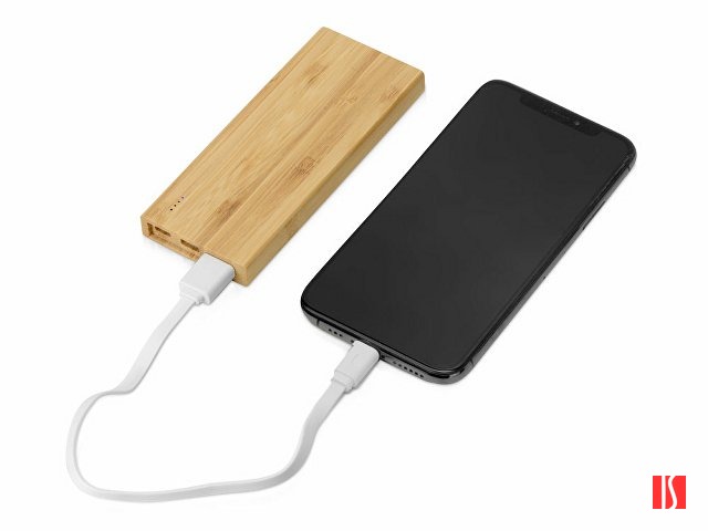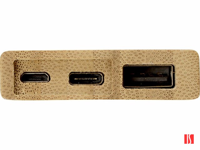 Заказать с нанесением логотипа от компании «Синтезис». Компактный повербанк из бамбука размером меньше смартфона. Натуральный материал эстетичен на вид и приятен на ощупь. Литий-полимерный аккумулятор на 5000 мАч обеспечит от полутора до двух полных зарядок среднего смартфона. Внешний аккумулятор имеет 2 входных разъема (micro USB, USB-C) и один выходной разъем USB. В комплекте кабели micro USB, USB-C, Lightning / iPhone. Поставляется в крафт упаковке из переработанной бумаги.