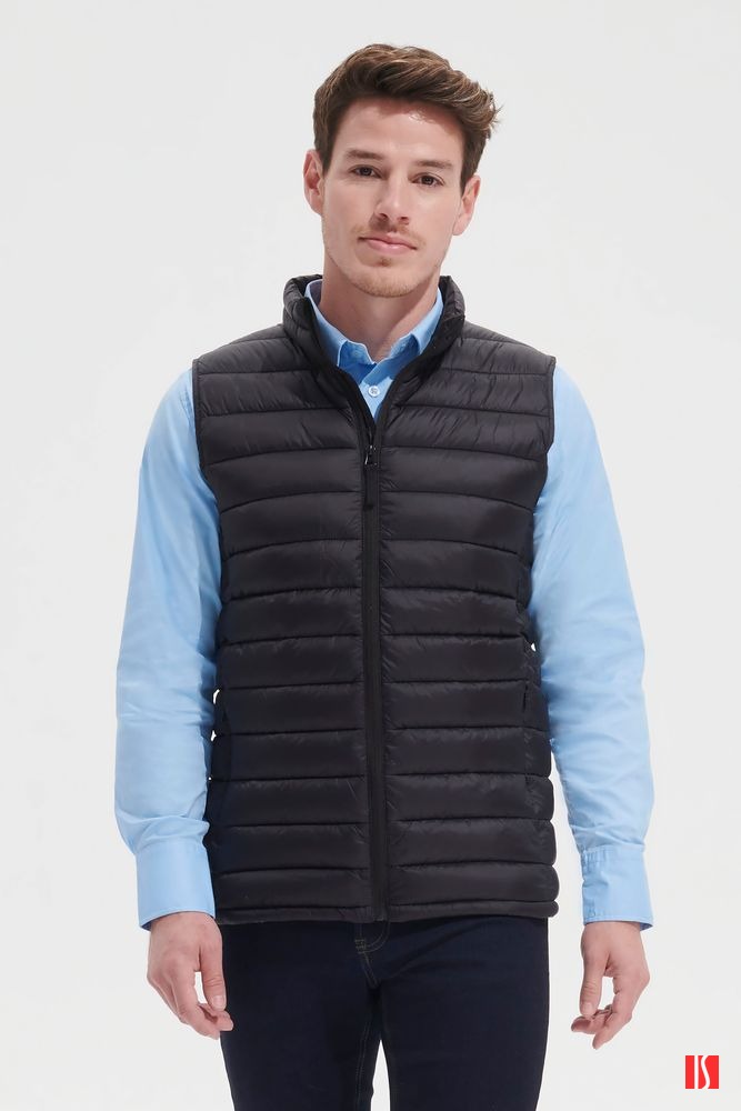 Заказать с нанесением логотипа от компании «Синтезис». Мужской стеганый жилет облегающего кроя на молнии с воротником-стойкой.