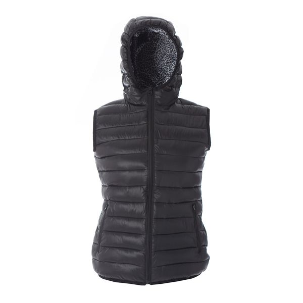 Легкий женский жилет с капюшоном. Облегченная пластиковая молния со съемным пуллером в тон изделия. Два передних кармана на молнии. Один внутренний карман на липучке. Cтягивающая эластичная резинка по низу изделия, в рукавах и капюшоне. Контрастная подкладка леопард.