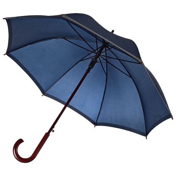 Заказать с нанесением логотипа от компании «Синтезис». Зонт со светоотражающей полосой обеспечит вас дополнительной защитой в темное время суток, повышая видимость для водителей и пешеходов благодаря ярким отражающим элементам.